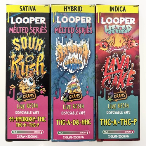 Looper XL Live Resin Disposable 3g, featuring 3000mg of cannabinoid blends including 11-HYDROXY-THC, THC-B, THC-P, THCP-O, D9-O, HHC-P, and THC-JD.